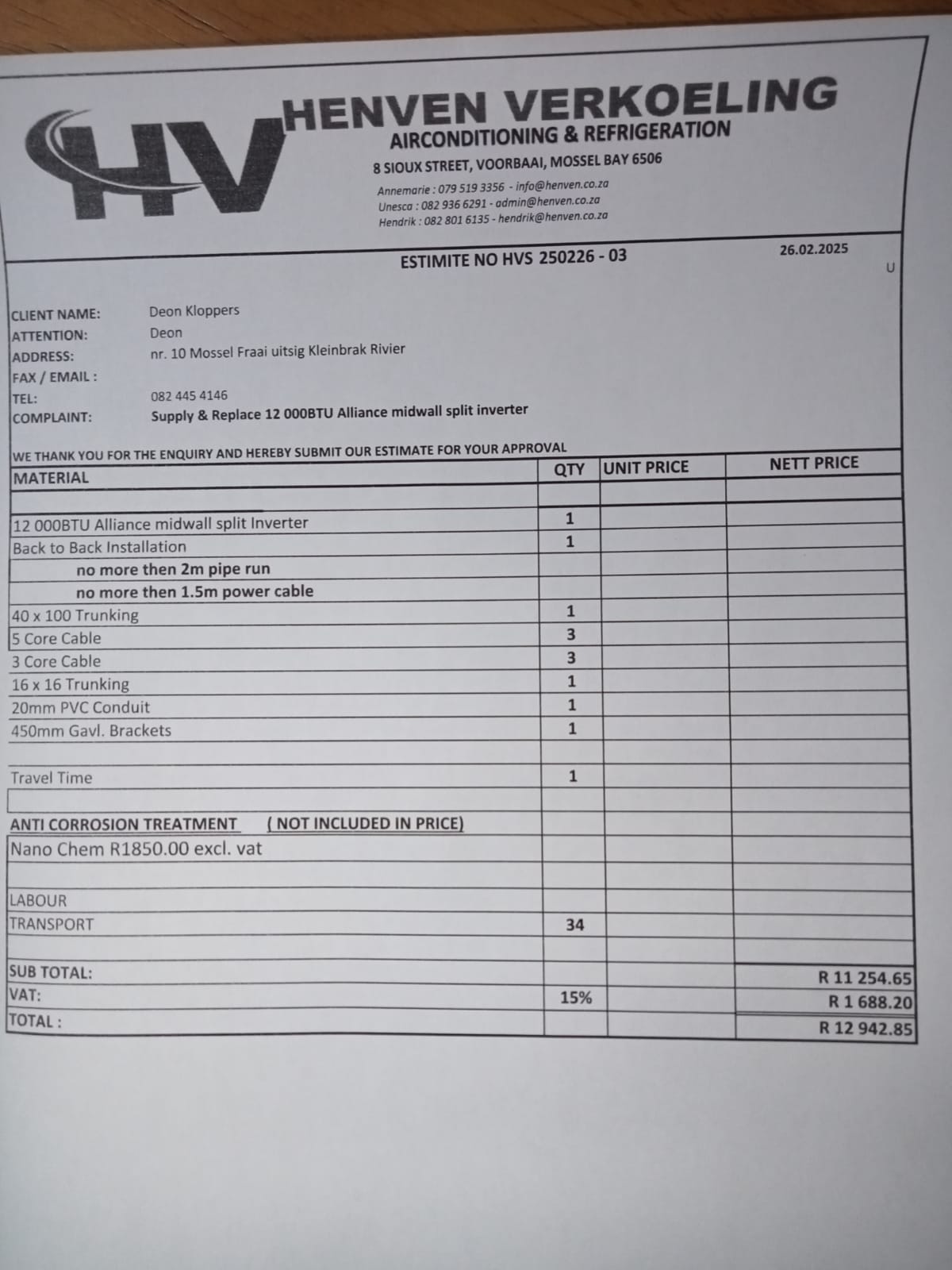 INV250327 - 01 Deon Kloppers - Supply & Install 12 000BTU Alliance midwall split Inverter.xlsx PHOTO-2025-02-26-15-56-59.jpg PHOTO-2025-02-27-10-19-25.jpg Payment Invoice Deon Kloppers.pdf Payment Storm.pdf Payment deposit.pdf Quote breakdown.xlsx